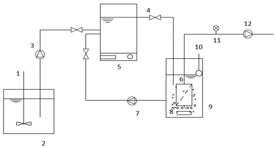 The anoxic/oxic membrane bioreactor (A/O-MBR) system (System 1). The system consisted of (1) an agitator; (2) a feed tank; (3) a feed pump; (4) an anoxic tank; (5) a magnetic stirrer; (6) a membrane; (7) a return pump; (8) an air diffuser; (9) an aerobic tank; (10) a water level controller; (11) a pressure gauge; and (12) a permeate pump.