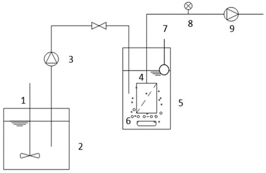 The oxic membrane bioreactor (O-MBR) system (System 2). The system consisted of (1) an agitator; (2) a feed tank; (3) a feed pump; (4) a membrane; (5) an aerobic tank; (6) an air diffuser; (7) a water level controller; (8) a pressure gauge; and (9) a permeate pump.