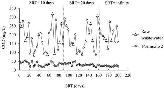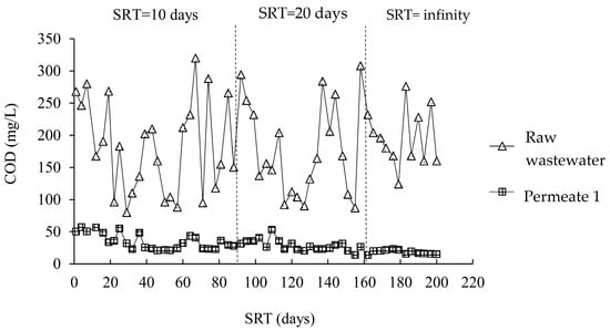 Figure 3 and Figure 4 illustrate how the COD concentrations in the A/O-MBR and O-MBR systems changed during the experiment at different SRTs. Table 2 shows the COD concentrations at different SRTs in the A/O-MBR and O-MBR systems. In the A/O-MBR system, the COD concentration in the raw water influent fluctuated. However, the COD concentrations in the permeate from the A/O-MBR system were stable. The COD concentration in the raw water influent for SRTs of 10 days, 20 days, and infinity were 193.5 ± 85.3 mg/L, 174.1 ± 80.6 mg/L, and 218.6 ± 61.1 mg/L, respectively. The COD concentrations in the permeate for SRTs of 10 days, 20 days, and infinity at steady state were 28.9 ± 8.9 mg/L, 28.9 ± 5.1 mg/L, and 17.4 ± 4.1 mg/L, respectively. Since the two systems were operated in parallel, the COD concentrations in the raw water influent in the O-MBR system were similar. The COD concentrations in the permeate for SRTs of 10 days, 20 days, and infinity at steady state were 29.3 ± 10.7 mg/L, 30.5 ± 3.7 mg/L, and 21.2 ± 4.2 mg/L, respectively. In addition, the effects of the pH [1,19,20], alkalinity [21,22], dissolved oxygen [23,24], and the ratio of MLVSSs to MLSSs [25], supporting the COD results, are shown in the Supplementary Materials.
