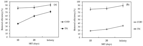 The effects of the A/O-MBR and O-MBR systems in terms of COD removal are shown in Figure 5. The COD removal efficiencies of the A/O-MBR (System 1) and O-MBR (System 2) systems at a SRT of 10 days were 82.4% and 79.3%, respectively. The COD removal efficiencies of Systems 1 and 2 at a SRT of 20 days were 84.3% and 81.5%, respectively. The COD removal efficiencies of Systems 1 and 2 at a SRT of infinity were 91.5% and 89.8%, respectively. It was observed that an increase in the SRT led to an increase in the COD removal efficiency. The reduction in the COD was due to the conversion of organic matter into carbon dioxide, water, and microbial cells during the decomposition of organic matter [26]. The membrane bioreactor systems disposed of excess sludge more efficiently than conventional treatment systems. As a result, the amount of organic matter used in cell production was lower. Therefore, the conversion of organic matter into carbon dioxide was responsible for most of the COD loss.