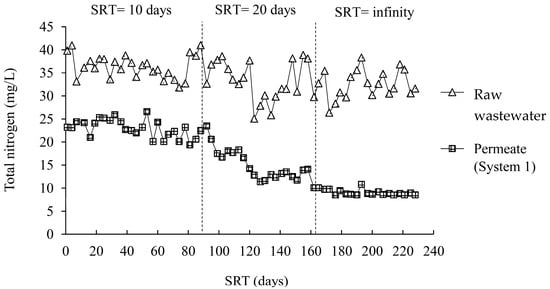 Total nitrogen concentrations during the experiment at different SRTs in the A/O-MBR system (System 1).