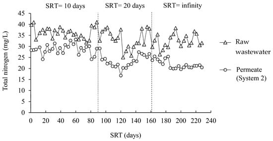 Total nitrogen concentrations during the experiment at different SRTs in the O-MBR system (System 2).
