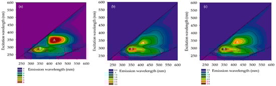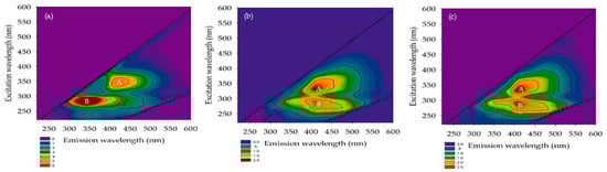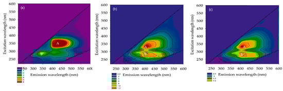 FEEM of the A/O-MBR and O-MBR systems at a SRT of 20 days. (a) Raw wastewater. (b) Permeate from A/O-MBR (System 1). (c) Permeate from O-MBR (System 2).