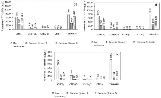 In the case of the THMFP measurement, the raw wastewater and treated wastewater samples were examined following the standard methods 5710 B, 4500-Cl B, and 6232 B [18]. The formation potential of the THMs was analyzed for chloroform (CHCl3), bromodichloromethane (CHBrCl2), dibromochloromethane (CHBr2Cl), and bromoform (CHBr3). The THMFP measurement consisted of three steps: (1) a free chlorine residual measurement, (2) liquid–liquid extraction, and (3) sample analysis. Firstly, the THMFP test was conducted for 7 days. At the end of the 7-day reaction period, samples had a remaining free chlorine residual of 3–5 mg/L. The residual chlorine was measured using a portable spectrophotometer (HACH, DR/890 colorimeter) before proceeding to the next step. Pentene was used as the solvent. The extracted solution was kept in a refrigerator under 4 °C. Finally, the extracted solution was taken and analyzed using gas chromatography (GC-ECD) (Hewlett Packard, HP 6890 GC, Agilent Technologies, Inc., Santa Clara, CA, USA) with an RTX-624 column.