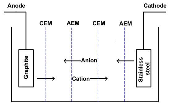 The membrane involving method is mainly divided into two categories: reverse osmosis and electrodialysis. The former has disadvantages, such as high requirements for water quality, low fresh water yield and easy scaling of membranes [6]. As an old desalination method, the latter has the advantages of low requirements for pretreatment, convenient operation and maintenance, less chemical dosage, low energy consumption and long service life of the device and has certain advantages in high brine treatment [7]. Therefore, electrodialysis seawater desalination has become a research hotspot.