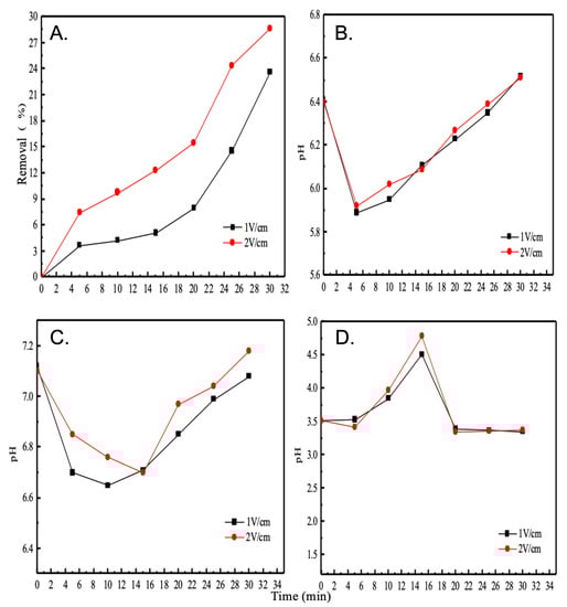 Again, the pH drops slightly at first; however, as the time increases, there is a slight rise in pH of the solution at both voltage gradients, with a slight alkalinisation, and the change curve of pH at a voltage gradient of 2 V/cm is always above 1 V/cm. Furthermore, comparing the concentrated chamber with the LCC, it can be seen numerically that the degree of alkalinisation is higher in the concentrated chamber than in the LCC.