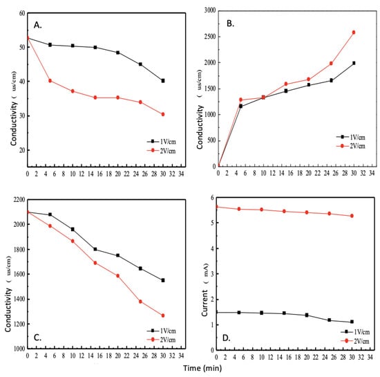 The solution inside the electrode chamber, as shown in Figure 4C, shows a gradual decrease in conductivity as the solution is continuously reacted and the number of ions inside slowly decreases as the electrolysis progresses. Furthermore, at a voltage gradient of 2 V/cm, the conductivity inside the electrode chamber decreases faster than at 1 V/cm, and the slope of the curve is larger.