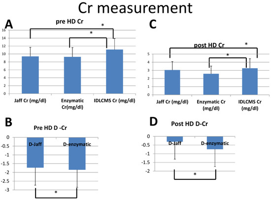 Creatinine measurement using the Jaffe and enzymatic methods as compared with the IDLCMS standard (* p < 0.05). (A) Creatinine measurement in the three methods before dialysis; (B) D-Jaffe and D-enzymatic before dialysis; (C) Creatinine measurement in the three methods after dialysis; (D) D-Jaffe and D-enzymatic after dialysis.