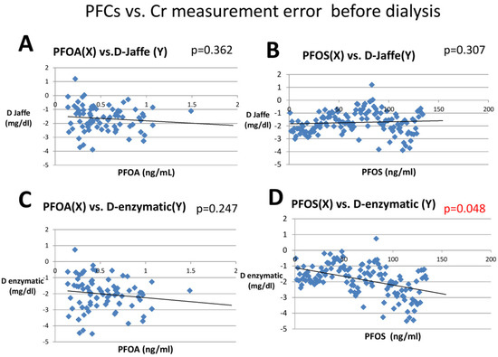 After dialysis, markers related to serum albumin, creatinine, and PFCs were analyzed in Table 4. Serum albumin lost its ability to associate with negative bias in both the D-Jaffe and D-enzymatic methods (Figure 3). There were lower PFOS levels post-dialysis and these did not affect serum creatinine values in the enzymatic method. However, serum creatinine was still strongly related with negative error for creatinine measurement.