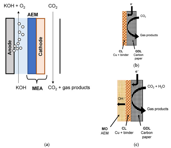 The schematic representation of the MEA configuration of the continuous flow membrane reactor, where the aqueous alkaline catholyte in the cathode compartment is replaced by a continuous humidified CO2 gas stream, and the solid polymer electrolyte AEM is depicted in Figure 1a, while the different architectures of the prepared GDE and membrane coated electrodes (MCE) are shown in Figure 1b,c, respectively. The difference is the effect of the membrane overlayer of the MCE on the performance of the CO2 reduction process to C2H4, which is also addressed in this work.