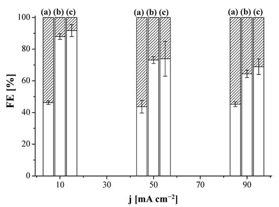 Faradaic efficiency (FE) of ethylene (blank) and hydrogen (striped) as a function of applied current density for the Fumatech MEA (FAA-3 AEM and Cu:Fumion GDE) (a), Sustainion MEA (Sustainion membrane and Cu:Sustainion GDE) (b) and the MEA composed by the Sustainion membrane and the Cu:CS GDE (c).