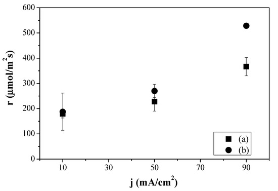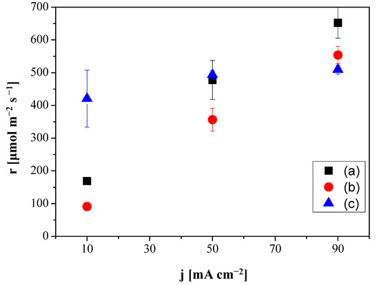 Figure 3 depicts the production rate of C2H4 as a function of current density for the CO2R performed at the electrodes Cu:Fumion GDE, Cu: Sustainion GDE and Cu:CS GDE, respectively. With the Sustainion MEA, the production of C2H4 ranged from 169 ± 10.3 to 652 ± 40 µmol m−2 s−1 with increasing current density from 10 to 90 mA cm−2, while the FAA-3 MEA generated 91.3 ± 1.3 µmol C2H4 m−2 s−1 at 10 mA cm−2 and 553 ± 26 mol m−2 s−1 at 90 mA cm−2. The reduction of HER vs. CO2R was less relevant with the Sustainion MEA. Nevertheless, it is worthwhile to note that the production rate of C2H4 at the Cu:CS GDE with a molar rate of 420 µmol/m2 s improved that of the commercial GDEs at the lowest current density (10 mA cm−2). Furthermore, with increasing absolute values of the current density, the production rate increase was still lower than that observed with the commercial anion-exchange MEAs but the FE(C2H4) of the latter decreased with current density and the C2H4 production rate increased monotonically, while the substitution of the alkaline commercial ionomers by CS solution led to a practically constant behavior of FE with increasing current density, as observed in Figure 2. These results agree with the recent observations made when coating the Cu NPs by hydrophilic or hydrophobic membranes [33] and the control of HER and CO2R by modifying the type of ionomer and alkaline conditions in Ag-GDEs [52,54].