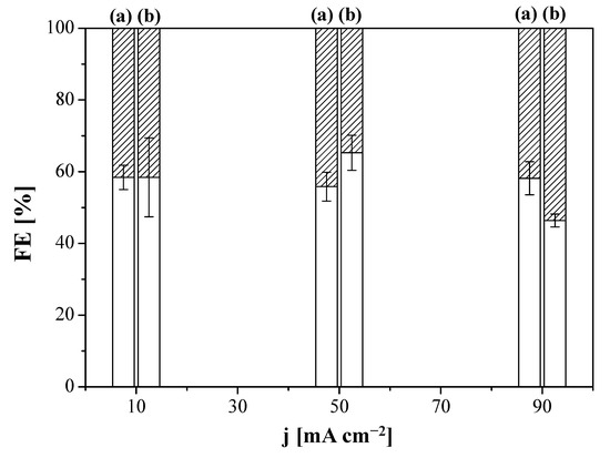 Faradaic efficiency (FE) of H2 (striped) and C2H4 (blank) obtained for the system with purely CS-based MEAs using the CS:PVA composite membrane (a) or the CuUZAR-S3@CuY/CS:PVA composite membrane (b) as compartment separator, as a function of applied current density. The electrode used in both cases was the Cu:CS GDE.