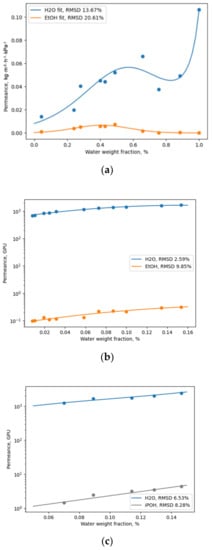 Illustration of experimental data approximation with Equation (13); solid lines represent fits and dots are experimental data from corresponding sources: (a) H2O/EtOH, SPI at 40 °C [20]; (b) H2O/EtOH, Pervap 4101 at 95 °C [24]; (c) H2O/iPOH, Pervap 2510 at 80 °C [23].