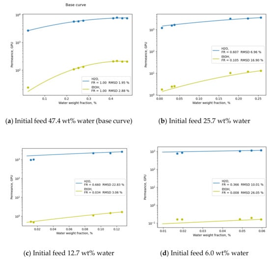 For the illustration of the accuracy of the proposed strategy, the data for Pervap 4100™ membranes [24] in terms of water/ethanol mixture separation with various initial feed concentrations (6–25 wt% water) at 95 °C were modelled. An experimental “wet” curve obtained in the range from an initial feed concentration of 47.4 wt% to a feed concentration of 2.4 wt% water was approximated using Equation (12) and tuned to represent each real curve with varying initial feed concentrations by the introduction of a corresponding FR parameter. The obtained curves, FR parameter and RMSD % values along with experimental data calculated from [24] are illustrated in Figure 2. It should be noted that there are some cases where swelling may cause irreversible changes to the membrane material, which may not be eliminated after drying; for these reasons, the aforementioned assumptions should be validated prior to usage in a particular case. The relatively low values of RMSD illustrated in Figure 2 for each of the modelled curves (b–d) favour the suggestion of the applicability of the FR parameter approach.
