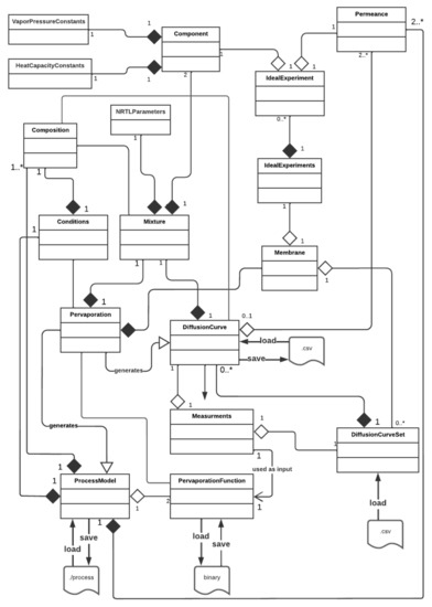 To provide a comprehensive understanding of the package’s applicability, limitations and possibilities, a representation of its architecture is presented in Figure 3 in the form of a high-level UML class diagram. A brief description of the main classes, which represent physical and theoretical objects required for modelling the pervaporation experiment employing the PyVaporation package, is provided to increase the transparency of the theoretical background of implementation and provide clarity, which are necessary for a specialist to use the developed solution.