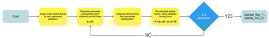 Partial flux calculation in the PyVaporation package is implemented in the calculate_partial_fluxes() method of the Pervaporation class. T and composition of the feed mixture, along with the required precision, must be specified for the calculation. The algorithm for the calculation is simple and is schematically represented in Figure 4. The precision parameter represents the acceptable difference between permeate compositions at consecutive calculation steps if a user specified the permeate pressure or temperature parameters. The calculation of the permeate pressure at a user-specified temperature is performed based on the NRTL model, so it is valid only at temperatures above the mixture’s freezing point. When the precision criterion is met, the system considers the calculation complete and returns partial flux values as a tuple. The default precision value specified for the calculation is 0.03%. A user may also specify the permeances of the components for the calculation; if they are not provided, the method calculates them based on the data provided in the IdealExperiments object of the Membrane. An illustration of the precision parameter’s influence on the calculated partial flux values is provided in Scheme 10.