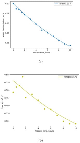 Comparison of experimental (dots) [45] and modelled values with PyVaporation on the basis of literature [24] (curves) data on the water fraction in feed (a) and water flux (b) as functions of processing time along with the corresponding RMSD values.