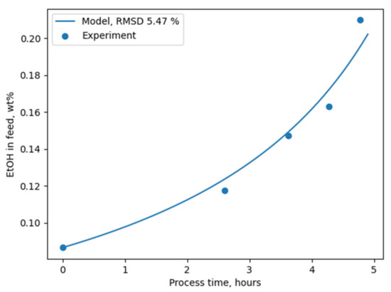 For further evaluation of the PyVaporation package’s performance, an isothermal experiment at 68.8 °C involving the separation of the water/ethanol mixtures with an initial ethanol concentration of 8.7 wt% was performed using Romakon-PM 102 membranes. The effective membrane area in the cell used was 25.5 cm2, the initial feed amount was 60 g and the absolute permeate pressure was measured to be 2 ± 1 kPa. The data on the performance of Romakon-PM 102 reported in [15] were used for modelling, and a description of the experimental setup and methods used is provided in the Supplementary Materials. The code used to model the experiment is given in Scheme 13, and the evaluation of the model obtained with PyVaporation against the experimental data is illustrated in Figure 6.