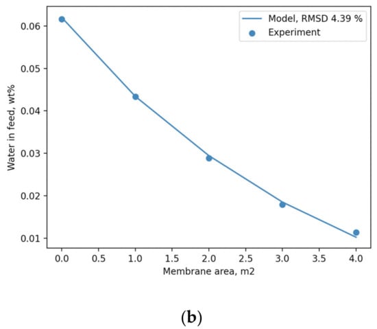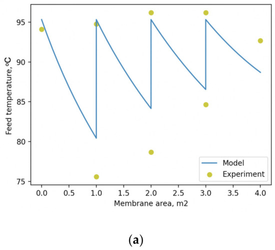 The comparison between the modelled and experimental temperatures within the membrane node illustrated in Figure 7a allows us to conclude that the absolute difference between them does not exceed 5.5 °C. The predicted concentration of the feed mixture as a function of membrane area, illustrated in Figure 7b, indicates a good correlation with experimental data, which is characterized by an RMSD value of 4.39%. Judging by this, the performance of PyVaporation is not inferior to that of the original model proposed by the authors in [45] for application to modelling adiabatic non-ideal pervaporation process.