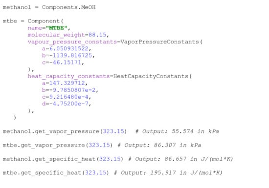 There are several pre-defined components that are commonly separated through pervaporation, and are stated directly as attributes of the Components class. The corresponding parameters of these components were validated against experimental data prior to inclusion in the package. An example of a new component’s creation from pre-defined and user-specified parameters and the calculation of some of its properties is presented below (Scheme 1):