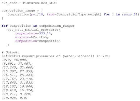 Real compounds are represented within the package as instances of the Component class. Components are defined with a name, molecular weight, a corresponding set of constants for the calculation of their individual saturated vapour pressure with Equation (7) or Equation (8) and a set of constants for the calculation of their molar heat capacity with Equation (19). Thus, the system may calculate their saturated vapour pressures, enthalpy of vaporization (Equations (16) and (17)) and heat capacity at a given process temperature by calling corresponding methods. A user may specify the type of the equation intended for the calculation of saturated vapour pressures and evaporation heats by filling a string-type parameter of the VapourPressureConstants object used for the creation of the component. Although the Frost equation may, in some cases, provide a better fitting for the vapour pressure data, due to the data’s abundance, the Antoine type of calculation is set as default.
