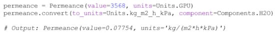IdealExperiment objects are purposed to store information on the transport properties of the membrane in relation to the individual component in terms of the modelled process, assuming its ideality, including the name of the component, temperature of the experiment, permeance value and apparent activation energy of the component’s permeation. While being optional, the apparent activation energy of a component may be calculated if data on the component at two or more different temperatures are provided based on linear least-squares regression. IdealExperiment objects are used for modelling ideal processes, where the permeance values for components do not change significantly over the concentration range considered. To provide a comfortable way of working with different permeance units (SI, GPU or kg⋅m−2⋅h−1⋅kPa−1), permeance values are represented as instances of the Permeance class defined with a value and units. The class allows conversion between the supported units by calling the convert() method, with the corresponding parameters (Scheme 3). IdealExperiment objects are associated with the object of the IdealExperiments class, which could be used to define a membrane and is loaded from a .csv file.
