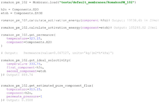 There are some useful methods defined for the Membrane class purposed for the calculation of the apparent activation energy of a particular component, permeance of a particular component at a specified temperature (Equation (11)), based on IdealExperiments object, calculation of ideal selectivity values (Equation (3)) of two components at a given temperature and the estimation of a pure component flux of the component at a given temperature (Equation (2)). An example of loading and working with a Membrane object is provided below (Scheme 4). Pervap 4101, along with Pervap 4100 [24], Pervap 2510 [23] and Romakon PM 102 [15], were added as default membranes to the PyVaporation package in order to provide a researcher with a reference for the correct format of a Membrane directory.