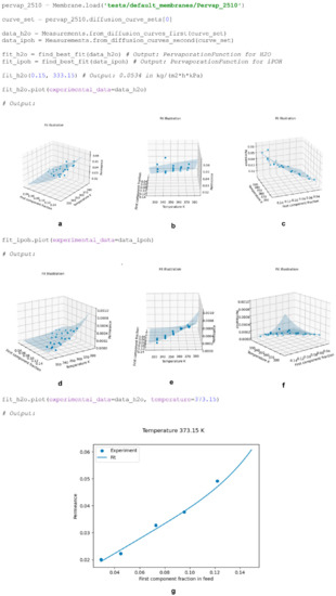 Creation, calling and plotting of a PervaporationFunction object. The data on Pervap 2510’s performance in relation to the separation of water/isopropanol mixtures were taken from [23]. Three-dimensional plots generated in Python are interactive; (a–c) projections of H2O permeance fitted surface along with experimental data, (d–f) projections of iPOH permeance fitted surface along with experimental data, (g) fitted H2O permeance as function of feed mixture concentration at 373.15 K (cut of the permeance surface at 373.15 K).