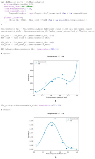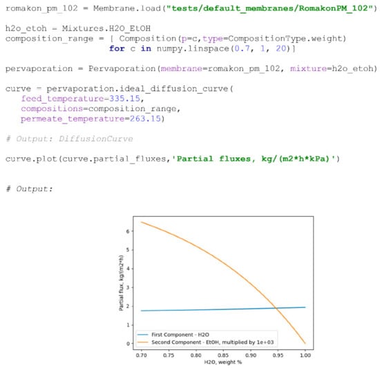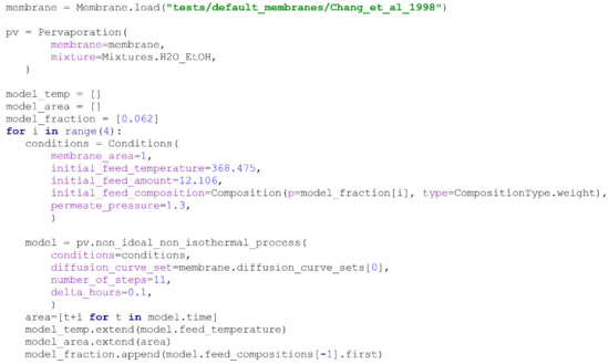 Additionally, the modelling of a non-ideal non-isothermal process with PyVaporation was evaluated against the experimental data reported by Chang et al. [45] on the pervaporation separation of water/ethanol mixture. Time-dependent process modelling implemented in PyVaporation was treated as quasi-stationary by interpreting the feed amount as a mass flux and time as the corresponding linear dimension. The initial feed mass flux was calculated from the volume flux values reported in the work by multiplying it by the corresponding mixture density value. The experimental data on the membrane performance reported by Chang and colleagues were used as the basis for modelling. The feed temperature reached during interstage heating was averaged throughout the obtained experimental values and assumed to be 95.3 °C. The code used to perform modelling is provided in Scheme 14, while the modelling results are illustrated in Figure 7, along with the corresponding experimental values.