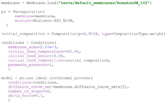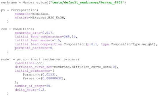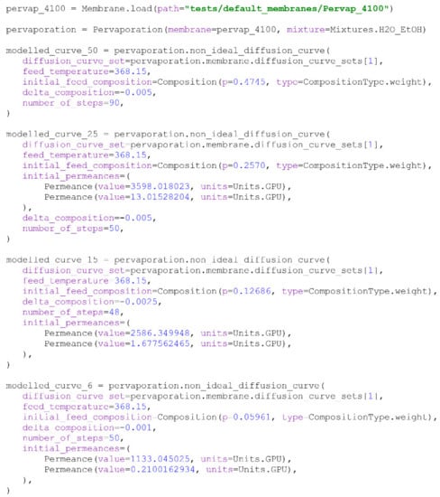 By providing the initial permeances of the components at the beginning of the considered process, which are equivalent to the “dry” measured permeances of the components at the initial feed composition stated, a researcher may account for the influence of membrane swelling on the membrane’s performance. Equations (13) and (14) are used for the assessment of the membrane performance’s change with the change in the initial feed concentration of the process. Such an approach must be applied with care; however, it was proven to be able to describe real “wet” diffusion curves at various initial feed compositions based on the reference “wet” curve and the “dry” permeance values of the components at initial feed compositions of interest. An example of the code used for the modelling of Pervap 4100™ diffusion curves at 95 °C and different initial feed concentrations based on the curve fit illustrated in Figure 2a is presented below (Scheme 8).