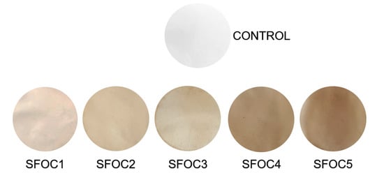 The OP analysis was done to investigate the practical application of the obtained membranes in fatty food packaging. As shown in Table 4, the OP of the control film was 0.027 g × mm × m−2 × day−1. After adding SFOC, the values increased from 0.017 to 0.034 g × mm × m−2 × day−1. No significant difference (p > 95%) were found between the control sample and the membranes with 0.1 g and 0.2 g SFOC. On the contrary, significant differences (p < 0.05) were found when the addition of flour increased (0.4–0.5 g). The results obtained were much lower than those obtained by Cao et al. [42] in edible films obtained with cassia gum reinforced with carboxylate cellulose nano crystal whisker (0.5, 0.1, 0.064 and 0.067 g × mm × m−2 × day−1). Therefore, SFOC-based films are promising for the packaging of oil-rich foods.