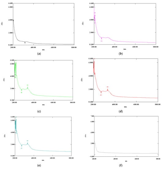 The films were cut into strips (1 cm × 3 cm) and placed inside a spectrophotometer test cell. All of the measurements were performed using air as the blank reference [28].