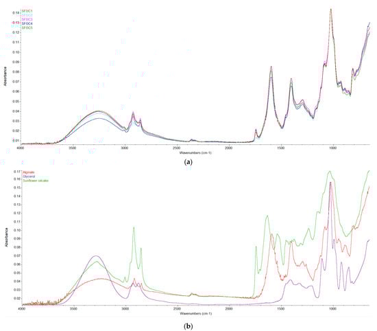 The membranes, pure alginate, glycerol and SFOC powder were analyzed using FT-IR spectroscopy. The spectra were recorded within the range of 400 cm−1 to 4000 cm−1 using a Nicolet iS20 spectrometer (Thermo Scientific, Karlsruhe, Germany), equipped with an attenuated total reflectance accessory and a diamond crystal. Spectra were collected at 4 cm−1 resolution and 32 scans. The obtained spectra were processed with OMNIC software [37,47].