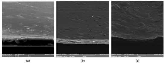 The surface and cross-section of the obtained films were analyzed by SEM (Tescan Vega II LMU, Tescan Orsay Holding, Brno, Czech Republic). The films were cut into small pieces and were fixed on double-sided adhesive carbon bands. The images were analyzed at an acceleration of 30 kV and were collected at 1 kx and 700× magnifications.