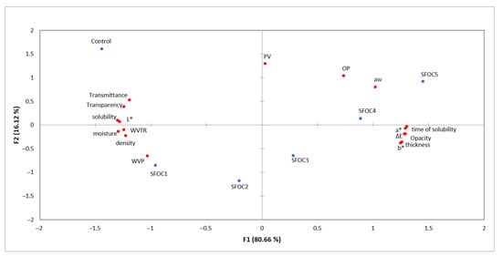 The relationship between the water-affinity properties, barrier characteristics, optical properties, density and thickness are presented in Figure 5. The two principal components explained 96.79% of the total variance (PC1 = 80.66% and PC2 = 16.12%). The PC1 was associated with the optical properties (L*, a*, b*, ΔE*, opacity, transparency and transmittance), water-affinity properties (aw, moisture, time of solubility, solubility), barrier properties (WVTR and WVP), density and thickness. On the other hand, only OP and PV were associated with PC2. Regarding the samples, good relationships were observed between SFOC1 and SFOC2 and between SFOC4 and SFOC5.