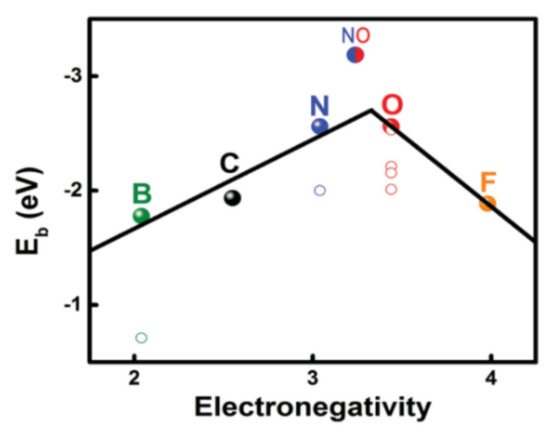 Although the modification of polyolefin separators with carbon materials can inhibit the shuttle of LiPSs between the two electrodes of LSBs to a certain extent, the interaction force between non-polar carbon materials and polar LiPSs is weak. Therefore, inhibiting the diffusion of LiPSs in the LSBs only by physical adsorption is not satisfied [37]. Compared with physical adsorption, chemical adsorption, which relies on the formation of chemical bonding forces between LiPSs and the surface atoms of adsorbent materials, can make a higher selectivity and achieve a better immobilizing effect of LiPSs [38]. For example, doping electronegative heteroatoms (such as N, O, and S, etc.) in carbon coatings can help trap LiPSs by the formation of Li–X bonds (dipole–dipole interactions) between heteroatoms and LiPSs [39,40]. Hou et al. [41] analyzed the ability of various atomically doped graphene nanoribbons (GNRs) to adsorb sulfur and Li2Sx by density functional theory (DFT). It was found that the adsorption effect of N and O (binding energy −2.53~−2.56 eV)-doped GNRs on Li2S4 is much greater than that of B, F, S, P, and Cl (binding energy −1.93 eV), which is due to the existence of dipole–dipole electrostatic interactions (~1.95 eV). The relationship between element electronegativity and binding energy is shown in Figure 2.