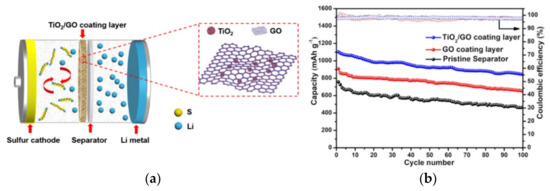 (a) Schematic diagram of LBSs with TiO2/GO coated functional separator. (b) Cyclic performance and coulombic efficiency of the LSBs batteries with different coated separators at a rate of 0.2 C [45].