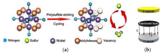 Adding other metals to monometallic compounds can also improve the reaction kinetics of LiPS transformation on the surface of metal compounds [50]. Zhang et al. [51] introduced Mo atoms into Ni3N and used a composite of multi-walled carbon nanotubes and Ni0.2Mo0.8N to modify the separator. During the electrochemical reaction process, the Mo atoms in the Ni0.2Mo0.8N are etched and leached out by LiPSs, leaving a large number of vacancies around Ni (Figure 5a). The vacancies formed can accelerate the charge transfer and the LiPS conversion. The potential of the Ni3N and Mo2N surfaces in the coating is higher than lithium negative electrode, thus creating an electric field between the separator and the lithium anode (Figure 5b), which promotes the directional movement of sulfur and lithium ions and inhibits the shuttling of LiPSs to some extent. The LSBs with this separator can achieve an initial battery capacity of 1097.2 mAh g−1 at a high rate of 5 C.