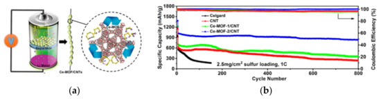 Due to the abundant pore structures and catalytic sites, metal–organic frameworks (MOFs) composed of organic ligands and transition metal ions have been widely used for catalytic modification of the separators of LBSs. The pore structure in MOFs can promote the adequate contact between the separator and the electrolyte and limits the diffusion of LiPSs, while the metal central ions can chemisorb and catalyze LiPSs [41]. Hong et al. [52] doped cerium-based metal-organic frameworks (Ce-MOFs) into CNTs to form Ce-MOFs/CNT separator coatings. The large specific surface area of Ce-MOFs and the ligated unsaturated Ce (IV) cluster nodes can rapidly adsorb LiPSs and accelerate the conversion between LiPSs and Li2S2/Li2S, which is shown in Figure 6a. As seen, under the high sulfur loading of 6 mg cm−2, the initial specific capacity of LSBs was 1021.8 mAh g−1 at 1 C, which slowly decreased to 838.8 mAh g−1 after 800 cycles with a decay rate of only 0.022% per cycle, as shown in Figure 6b. The coulombic efficiency of the LBSs was close to 100%, which suggesting its excellent cycle performance.