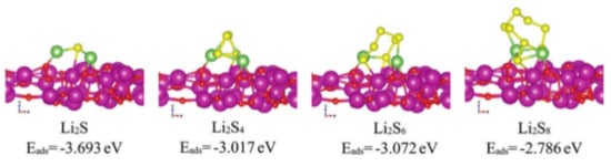 In addition to transition metal elements, rare-earth elements have also been used in the catalytic modification of the separators of LBSs. Peng et al. [53] prepared a novel pp separator coated with Eu2O3/Ketjen black (Eu2O3/KB). The exposed (222) plane of Eu2O3 exhibits strong polarity-polarity interaction with LiPSs, which is beneficial to confine the transfer of LiPSs. The adsorption energy of Eu2O3 with LiPSs is shown in Figure 7. Apart from that, oxygen vacancies in Eu2O3 can provide more catalytic sites for regulating Li2S precipitation. Therefore, with high crystal face index, Eu2O3 can lower the energy barrier for Li2S nucleation on it and promote the conversion of LiPSs to Li2S. The LBSs with Eu2O3/KB modified separator exhibited excellent cycling stability and rate capability. Its capacity decay rate achieved only 0.05% per cycle during 500 cycles at 1 C.