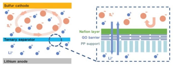 Nafion with rich sulfonic acid groups (-SO3H) is also widely used in the modification of the separators of LSBs. But due to the poor conductivity, an overly thick coating of Nafion will reduce the lithium-ion transport capacity of the separator [59]. Zhuang et al. [60] designed a ternary-layer separator composed of PP, graphene oxide (GO) and Nafion for LSBs (Figure 8), in which the ultrathin GO layer (0.0032 mg cm−2, about 40 layers) can cover the macropores of the PP matrix and provides support for the Nafion layer. The Nafion layer with the areal loading of 0.05 mg cm−2 also retains the conductivity of the separator while repelling LiPSs. The specific capacity of LSBs using the ternary layer separator can reach a discharge capacity of 1057 mAh g−1 at 0.1 C.