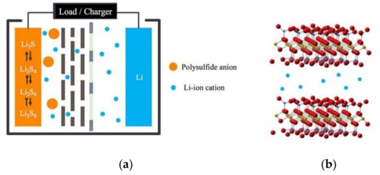 In addition, the confinement of LiPSs can also be achieved by using the charge environment between the two-dimensional material layers. Xu et al. [61] used two-dimensional vermiculite nanosheets to prepare the separators of LSBs, the structure of which is shown in Figure 9. The vermiculite nanosheet is negatively charged, so the positively charged lithium ions can be transferred between the layers, while the negatively charged polysulfide ions cannot diffuse due to electrostatic interaction. This effectively suppressed the transmembrane diffusion of LiPSs.