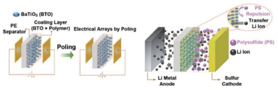 Besides negatively charged groups, some polar particles can also repel LiPSs through electrostatic effects. BaTiO3 (BTO) with high dielectric constant can generate a large number of positive and negative charges on the surface of BTO through spontaneous polarization, which can electrostatically interact with lithium ions and polar molecules LiPSs [62]. Yim et al. [63] embedded BTO particles into PE separators. The polar BTO forms permanent dipoles under the action of electric field (Figure 10), which can block LiPSs through electrostatic repulsion, thereby improving the cycling performance of LSBs. The polarized BTO coating can also enhance the mechanical stability of the PE separator and improve the capacity and cycle life of the LSBs. At a current density of 0.5 C, the LSBs with this separator applied achieves an initial discharge capacity of 1122.1 mAh g−1.