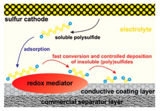 Maletti et al. [65] prepared a lithium vanadium oxide (LiV3O8)-coated separator. The dense coating formed by LiV3O8 nanoparticles can cover the original macropore structure of the PP separator, forming a physical barrier to inhibit the diffusion of LiPSs. LiV3O8 can disproportionate with LiPSs to promote the conversion of LiPSs to Li2S2/Li2S (Figure 11). In addition, the LiV3O8 coating significantly reduces the resistance of the cell by facilitating charge transfer at the cathode/diaphragm coating interface. Compared with pure PP, the charge transfer resistance of LSBs with LiV3O8 separator was significantly reduced by 83%, with a high initial discharge capacity of 1254 mAh g−1 at a current density of 0.2 C and a capacity decay rate of 0.063% after 500 cycles at 0.5 C.