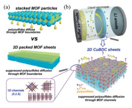 (a) Schematic illustration of granular and 2D sheet MOFs for inhibiting LiPSs; (b) schematic illustration of 2D CuBDC sheets with crystal structures of 1D nanochannels and 2D CuBDC sheets [66].
