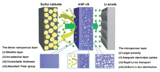 Compared with the traditional polyolefin separator, the electrospun nanofiber separator has higher porosity and chemical stability. The strong affinity of electrospun nanofibres for the electrolyte can significantly improve the mobility of lithium ions in LSBs, thereby effectively inhibiting the “shuttle effect” of LSBs [69]. Pei et al. [70] prepared a structurally asymmetric aramid nanofiber Janus separator (ANF-JS). The separator structure is shown in Figure 13. The side of the separator facing the positive electrode is a nanoporous layer with ion selectivity, which can hinder the shuttling of LiPSs between electrodes; the side of the separator facing the negative electrode is a microporous layer with a three-dimensional porous structure, which can provide channel for electrolyte absorption and fast lithium-ion transport. After 1000 cycles at 1 C with this separator, the capacity decay rate of the LSBs is reduced to 0.0195% per cycle.