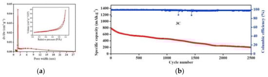 (a) Pore size distribution and N2 adsorption−desorption isotherms of TCNFs; (b) cycling performance of CMK3−S/TCNFs at high current density 3 C [72].