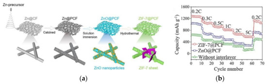 (a) Schematic diagram of preparation process of ZIF-7@PCF interlayer; (b) the rate capability of cells with ZIF-7@PCF, ZnO@PCF interlayer, and without interlayer [73].