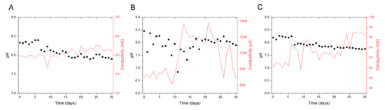 pH and conductivity profile of the (A) seawater feed, (B) SWRO permeate, and (C) SWRO brine during the 30-day pilot test study.